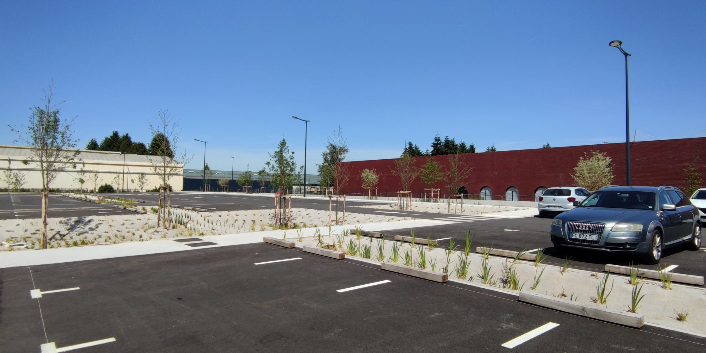 Cet aménagement est accompagné de cheminements cyclables (en béton micro désactivé aspect sablé) et piétons (en béton balayé) en cohérence avec le projet connexe Seine Eure Avenue. Trois poches de stationnement ont été réalisées autour du bâtiment : un parking de 150 places au nord de la parcelle (le long d’Hermès), un second de 97 places au Sud et un dernier de 12 places à l’entrée du site. Le ruissellement des eaux pluviales est géré sur tout le site par plusieurs ouvrages de rétention et d’infiltration paysagers. Enfin un patio a également été créé, à côté du bâtiment de coworking, Véritable espace de détente, il accueille des tables et chaises pour manger, un boulodrome, … Tout au long du projet, notre équipe n’a eu de cesse de prendre en compte les attentes et les besoins de la maîtrise d’ouvrage et des usagers, la coactivité avec les projets connexes ainsi que la problématique de conserver le Hub et la Filature accessible (phasage des travaux).