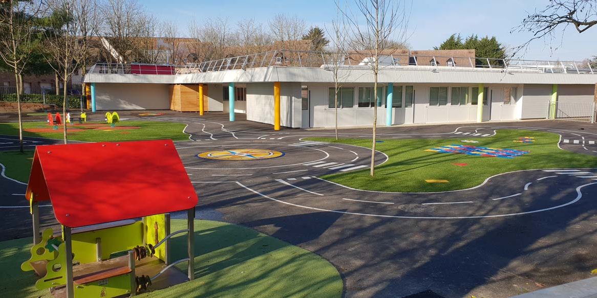 la cour de l’école Flaubert à Trappes. Vieillissante et peu attrayante pour les enfants, notre équipe a revu entièrement les revêtements de sol de la cour jonglant avec les couleurs et les jeux de texture. Chaque jeu à ressort est entouré d’un périmètre de sécurité en sol souple rouge. Un marquage au sol, d’initiation au code de la route, contourne et traverse l’aire de jeux. Au centre du rond-point est représenté une rose des vents. Un textile aiguilleté vert, donnant l’illusion d’herbe, comble et uniformise l’intérieur de l’aire de jeux. L’aménagement se veut multi-âge et pédagogue sur le thème de la nature.